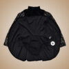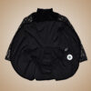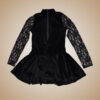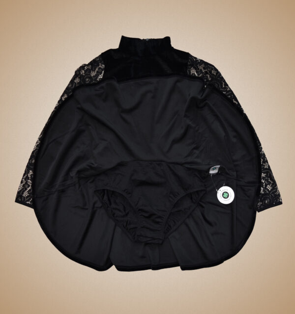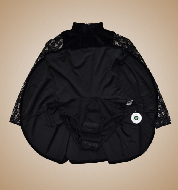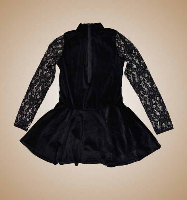 Beautiful black one piece skirt-top Irish dance dress for a variety of uses, such as a blackout dress, team dress, or solo costume. Flexible velvet skirt and velvet body, with lace sleeves. The skirt has bloomers with snaps, and the top has a zipper in the back, making dressing and undressing quick and easy. The lace sleeves have a tan liner. Durable and elegant.